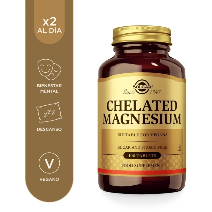 El Magnesio Quelado de Solgar® es magnesio que se presenta en una forma aminoquelada de fácil absorción. Contiene magnesio unido a dos moléculas del aminoácido glicina, constituyendo así un bisglicinato más cómodo de gestionar por el sistema digestivo y que puede atravesar las membranas celulares, presentando mayor absorción que otras formas inorgánicas de magnesio. Su combinación con óxido de magnesio permite crear un producto con alto contenido en magnesio elemental y alta biodisponibilidad. Con 100 mg de magnesio elemental por comprimido, puede ser adecuado para personas con diversas condiciones estomacales o que prefieren fraccionar las tomas a lo largo del día, y es el aliado perfecto para colaborar con el mantenimiento del sistema musculoesquelético, reducir el cansancio y la fatiga, y apoyar la función psicológica normal y el correcto funcionamiento del sistema nervioso.